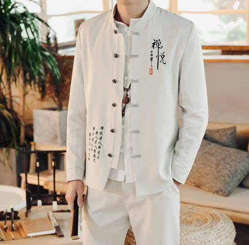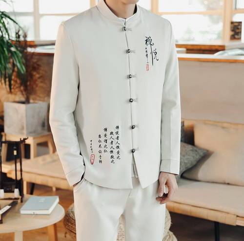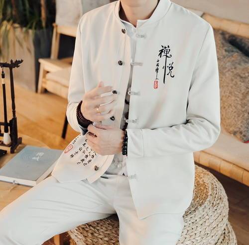灰白色立領(lǐng)外套,中山裝設(shè)計(jì),加上一些獨(dú)特的字母刺繡,如“禪”以及右下角的如詩的字,有種佛系的趕腳。整體顏色很純,加上版型寬松與垂墜感,修飾了身材,干凈利落,帥氣有型。