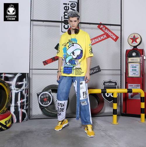黃色閃電蜘蛛俠T恤搭配藍(lán)色飄帶貼布拼接牛仔褲,是不是也挺好看呢