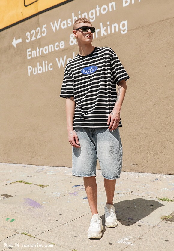 黑白條紋也是男生比較青睞的,青春洋溢,揮灑自如,牛仔短褲,小白鞋,搭上去更減齡。帶上墨鏡,起到畫(huà)龍點(diǎn)睛的作用,小哥哥不要太帥哦!