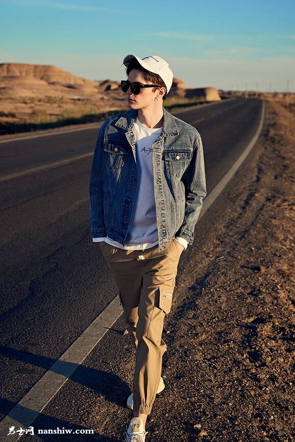 藍色牛仔外套+白色內(nèi)搭+卡其色工裝褲+運動鞋+棒球帽+墨鏡,工裝褲很有日系潮流風(fēng)格,有豐富的造型和層次感,帥氣又有范,造型時尚動感。