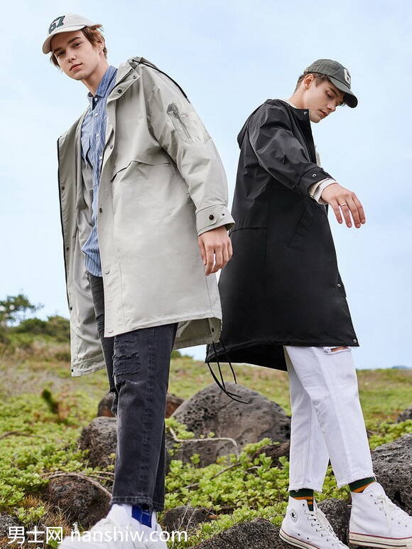 長款工裝外套,內(nèi)搭襯衫/T恤/圓領衛(wèi)衣,破洞牛仔褲(與工裝外套,黑白配/淺灰深灰配)+小白鞋+棒球帽,穿出潮男風格,適合高個子男生,帥的力量簡直無法阻擋。