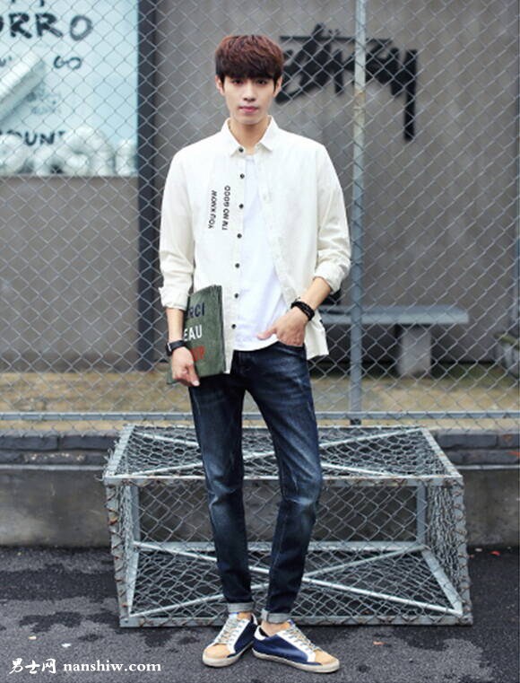 白色襯衣+白色T恤打底+深藍牛仔褲+拼色帆布鞋,帥氣利落有型,給人不一樣的觸感,彰顯青春活力。