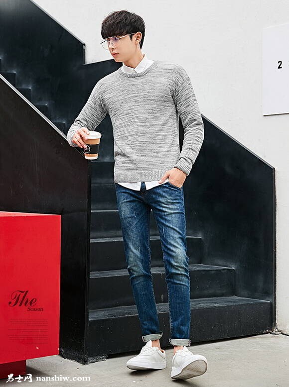 天氣轉(zhuǎn)冷,這樣的針織衫可以單穿,也可以搭配襯衫一起穿(如圖),簡單的配一條藍色水洗牛仔褲,穿一雙白色的板鞋,簡潔清爽,不管上班還是外出都能夠輕松應對。