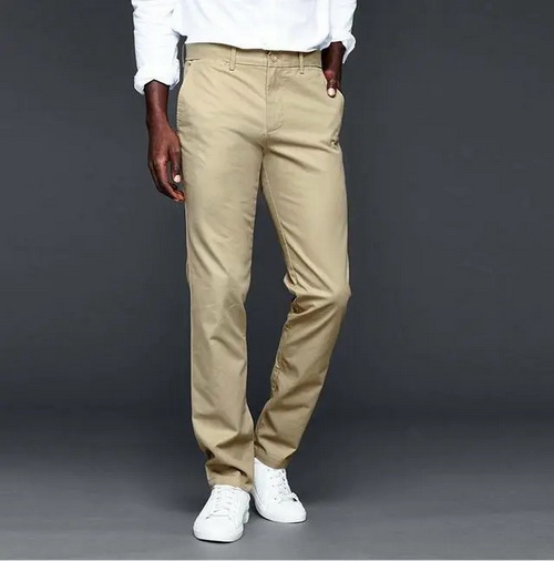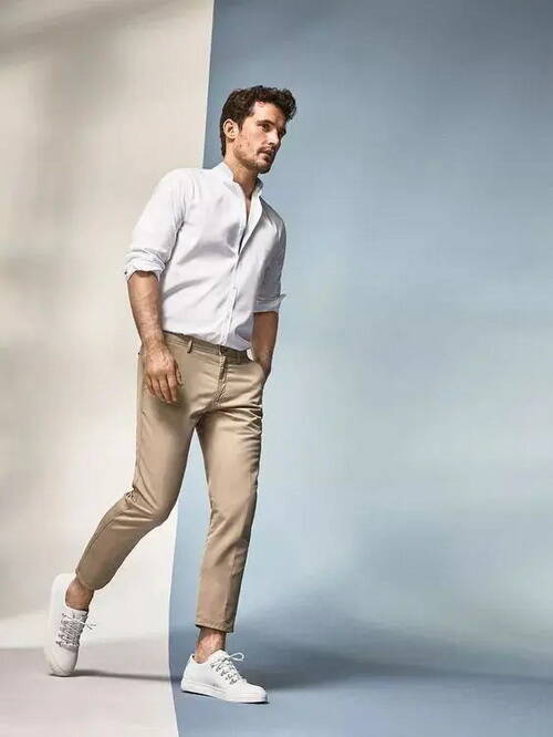 Chino褲面料耐磨,顏色耐臟,顏色豐富多樣。它具有很好的舒適性,但是搭配起來(lái)容易出現(xiàn)平淡無(wú)奇的效果。它中規(guī)中矩,不夠有型,雖然普遍,但存在感確實(shí)不高?ㄆ溲澥切湍腥粘T煨偷氖走x單品之一,雖然卡其褲看起來(lái)很單調(diào),但依舊能打造出多種的風(fēng)格。稍微直筒寬松或者錐形的款式,它的接受范圍廣泛,對(duì)于腿粗或者腿較瘦的伙伴都能駕馭,而且不會(huì)容易把搭配缺點(diǎn)露出來(lái)。