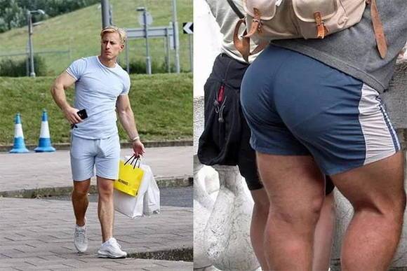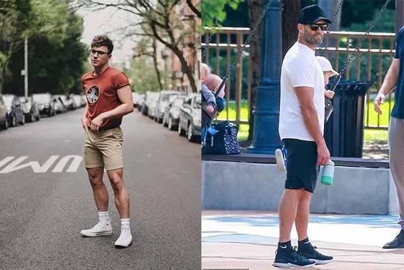 讓我們用身材非常粗勇的「The Rock」巨石強(qiáng)森來舉例:左圖中膝上短褲+低筒鞋款,露出了更多的腿部,相較于右圖中五分褲長(zhǎng)+高筒鞋款,視覺上的身材比例顯得更加高挑挺拔。