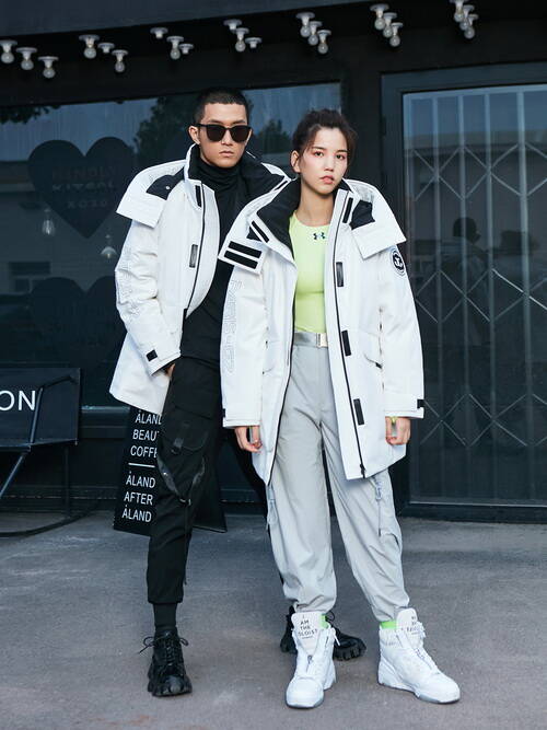 這款也是情侶款,不過(guò)這款有個(gè)大帽子,且是長(zhǎng)款,白色給人感覺(jué)干凈利落,男生白色羽絨服+黑色高領(lǐng)毛衣+黑色束腿修身工裝褲+黑色運(yùn)動(dòng)鞋+黑色墨鏡(神秘而帥氣)。女生白色羽絨服+黃色圓領(lǐng)T恤+灰色束腿運(yùn)動(dòng)褲+白色高幫運(yùn)動(dòng)鞋。