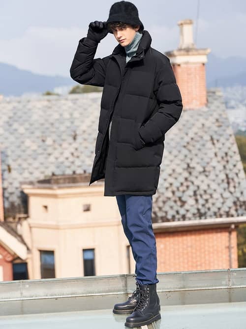 駱駝的這個(gè)長(zhǎng)款羽絨服,H型純色設(shè)計(jì),防風(fēng)防水,時(shí)尚易搭配,黑色羽絨服內(nèi)搭淺灰色高領(lǐng)毛衣,下身搭配藍(lán)色休閑褲,保暖做到細(xì)處,穿上高幫系帶皮靴,一點(diǎn)也不透風(fēng),頭戴黑色漁夫帽。這身搭配175-180的穿搭會(huì)更加的帥氣。