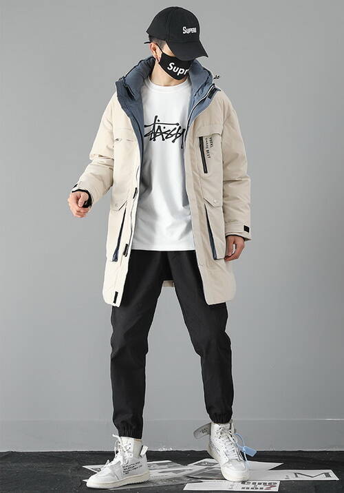 中長(zhǎng)款連帽米白色羽絨服搭,內(nèi)搭白色圓領(lǐng)衛(wèi)衣,下身搭配黑色束腿休閑褲,穿高幫白色板鞋,戴一頂黑色鴨舌帽,黑白配簡(jiǎn)單利落干凈。