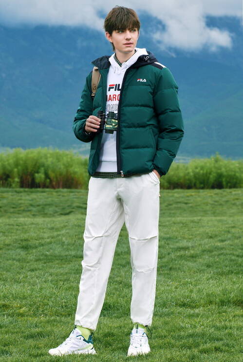 松山綠羽絨服,啞光質(zhì)感,挺括有型,內(nèi)搭白色連帽字母衛(wèi)衣,里面還可以如圖在搭配一件深色格子衫,下身搭配白色休閑運(yùn)動(dòng)褲,與上身內(nèi)搭相呼應(yīng),看著干凈舒服帥氣,穿淺綠色襪子,外穿白色老爹鞋。