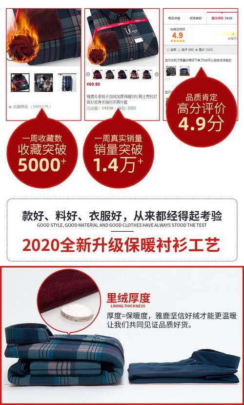 雅鹿男士保暖加絨加厚格子襯衣多色,30元券后39.9包郵2020-10-12