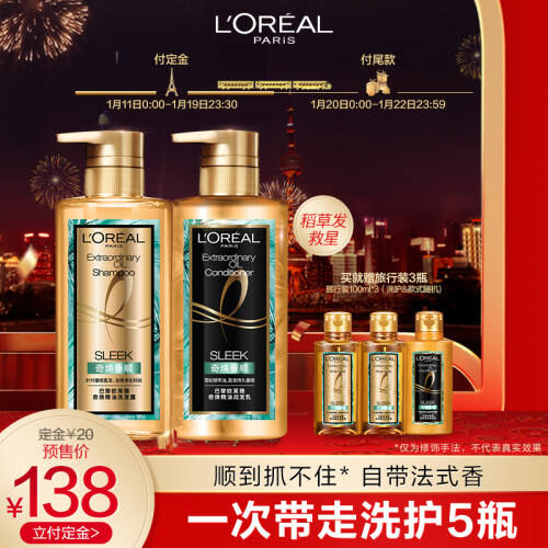 【預(yù)售】歐萊雅垂順大金洗護(hù)套裝440*2+旅行裝100ml*3,券后128包郵2021-01-17